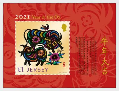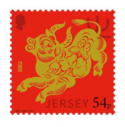 Year of the Ox was the subject of Jersey Post’s 2021 Lunar New Year issue. Symbolising prosperity, the stamp’s golden bull has its head raised upwards, signifying a longing for a wealthy future while its hoof, remains solidly on the ground, indicating a down-to-earth attitude. The miniature sheet depicts ‘the old cow licking her calf’ embodying parental love and representing a warm and happy family atmosphere.