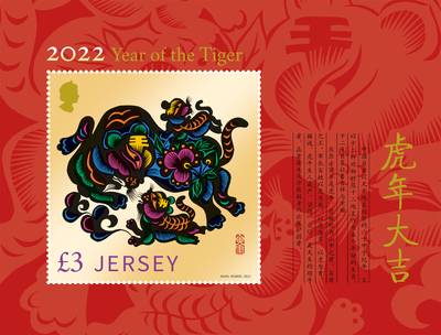 Two years ago (2022), Jersey Stamps issued the Year of the Tiger stamp. In China, tigers are seen as the creatures who rule the mountains, the king of all animals, and embody courage and strength. Wang Huming uses gold metallic ink to signify power, wealth, longevity, and happiness. Lunar New Year is a key event for families, the miniature sheet reflects that by having a mother playing with her cubs.