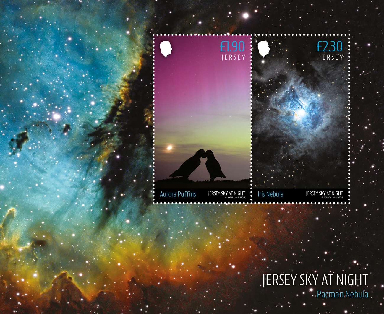 This issue includes a set of eight stamps and a souvenir miniature sheet. Three of the eight stamps feature iconic Jersey landmarks, including Grosnez castle, the wicker puffins, Archirondel tower. While the remaining five include beautiful space photography that focuses on a specific astronomy occurrence, such as a lunar eclipse.