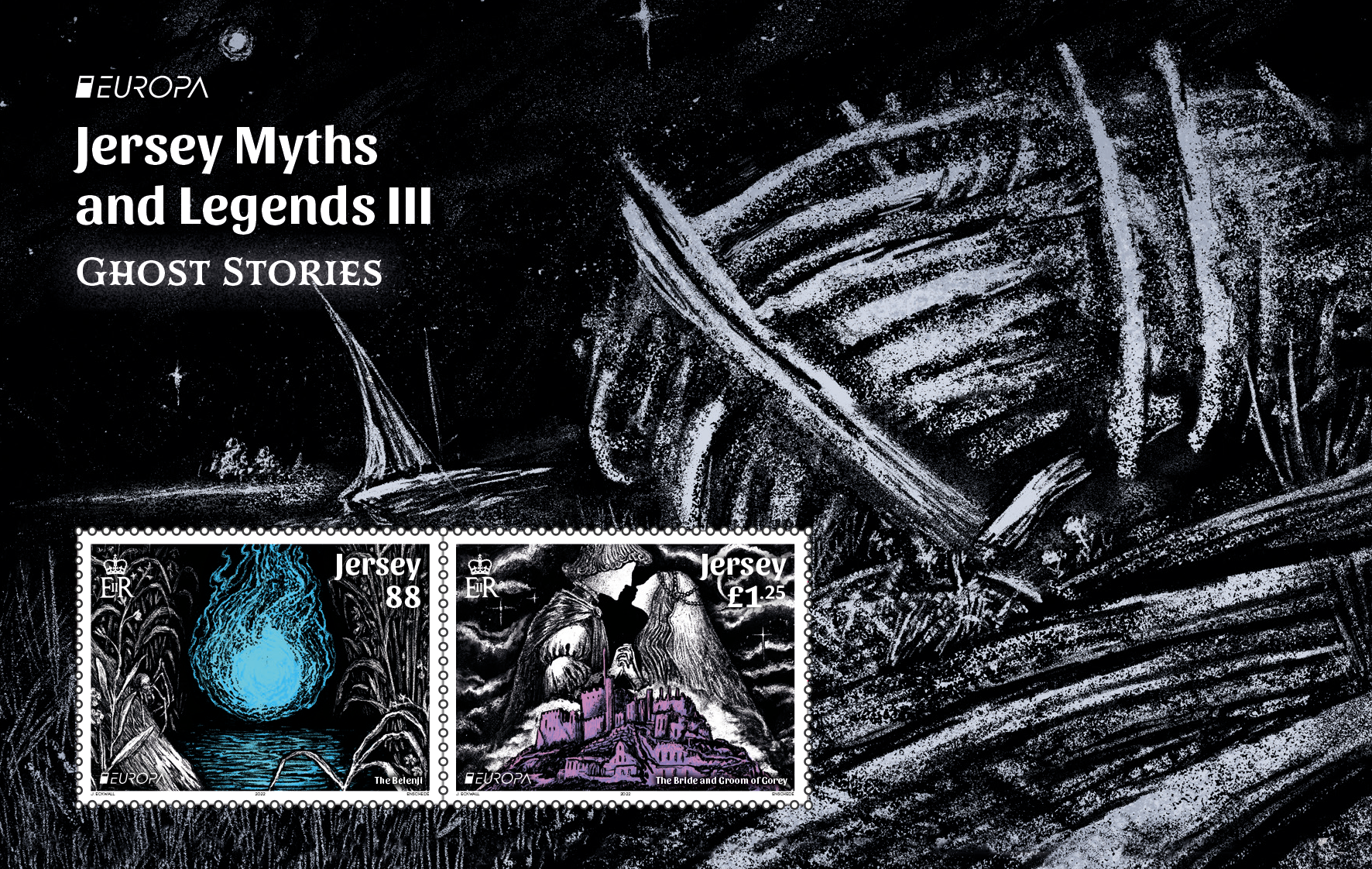 Six ghostly myths and legends will feature on a set of stamps to be issued by Jersey Post on 16 March, as part of the 2022 Europa stamp issue, Stories & Myths. The third in Jersey Post's Myths and Legends series, the issue focuses on ghost stories which have shaped Jersey’s history and culture. Two Europa stamps are included in the set and have been printed using a spot UV ink, which means that elements of the stamp illustrations take on an eery glow under ultraviolet light.
