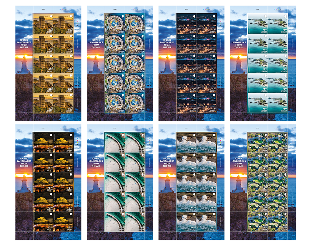 The complete sheet set from 'SEPAC Iconic Landmarks from the Air' issue. Images captured by local Jersey astronomy photographers Marc Le Cornu and James Bedding.