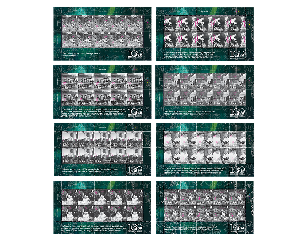 The complete sheet set of all eight stamps from our '100 Years of Gerald Durrell: Dedication' issue.