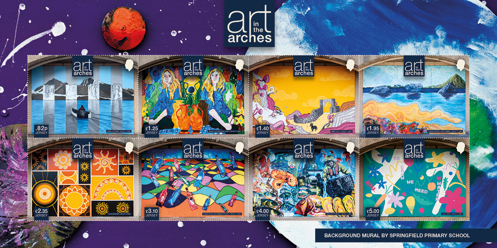 The souvenir sheetlet from our 'Art in the Arches' issue. Art in the Arches, which features amazing artwork created by local artists, schools and community groups who participated in the ArtHouse Jersey initiative Art in the Arches.