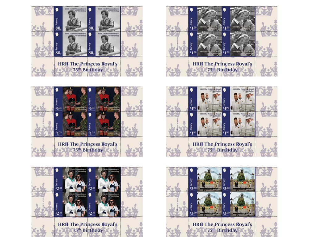 The Jersey Post stamp issue HRH The Princess Royal’s 75th Birthday celebrates 75 years of Princess Anne and her dedication to the public. The second child and only daughter of Queen Elizabeth II and Prince Philip, the Princess Royal is King Charles III only sister and the seventh Princess to hold the title of Princess Royal.