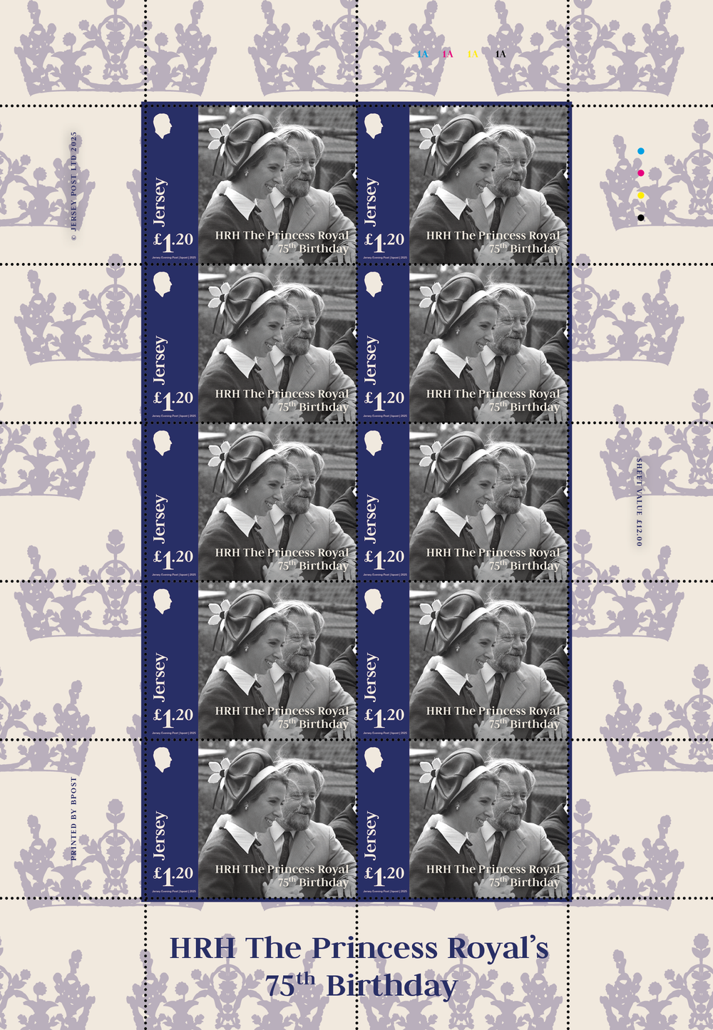 The Jersey Post stamp issue HRH The Princess Royal’s 75th Birthday celebrates 75 years of Princess Anne and her dedication to the public. The second child and only daughter of Queen Elizabeth II and Prince Philip, the Princess Royal is King Charles II only sister and the seventh monarch to hold the title of Princess Royal.