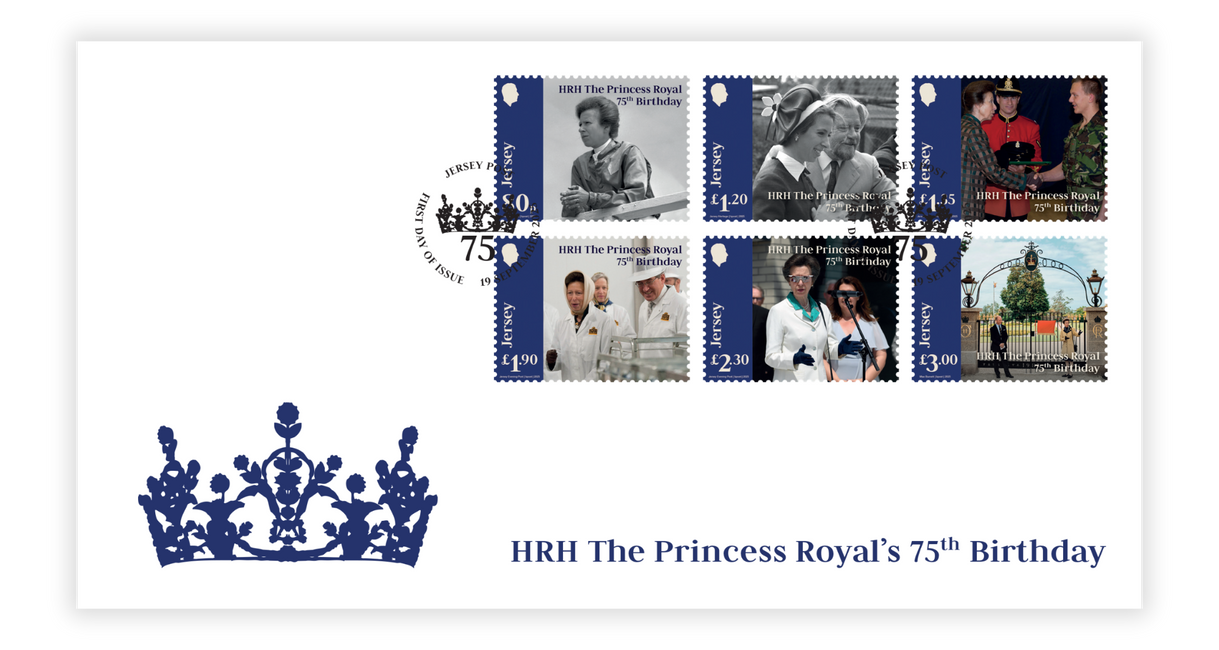 This First Day Cover displays the stamp set from our 'HRH The Princess Royal's 75th Birthday' issue. Photography by Jersey Heritage, Jersey Evening Post and Max Burnett.