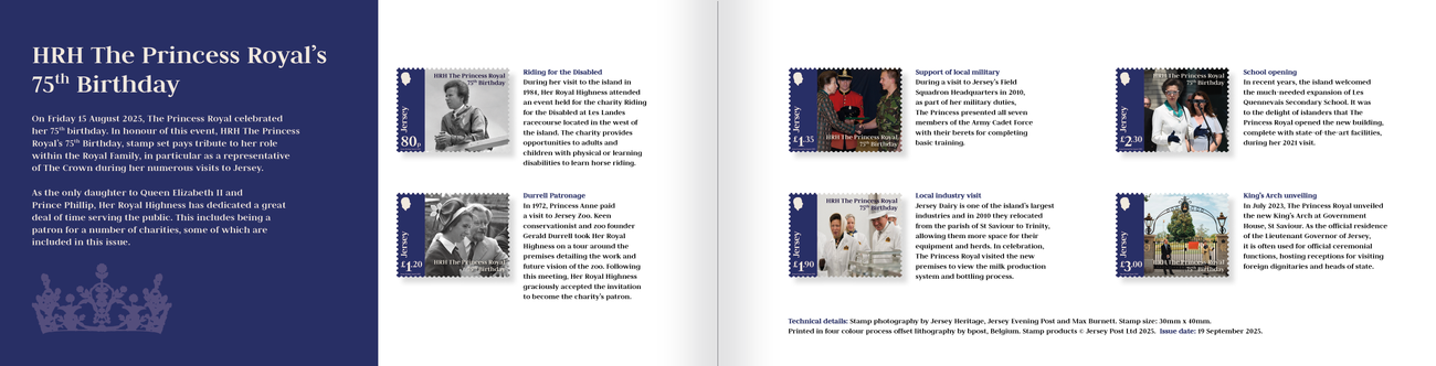 Her Royal Highness is involved with over 399 charities, organisations and military regiments in the UK and overseas and has visited Jersey 23 times in the line of duty to island and the local charities for which she is Patron or a supporter. The set of stamps highlight a variety of moments from Princess Anne’s visits to Jersey.