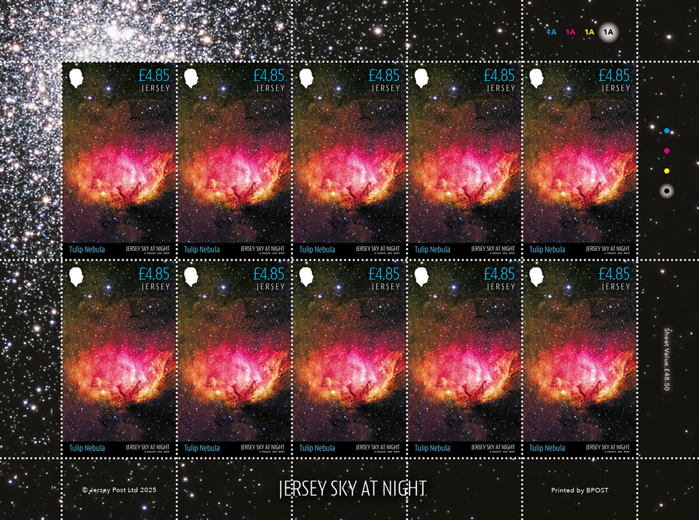 A Sheet of 10 Stamps from 'Jersey Sky at Night' issue. Images captured by local Jersey astronomy photographers Neil Maher and Gordon Pollock.
