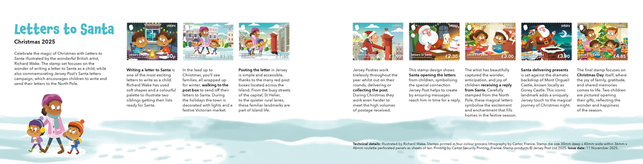 This Presentation Pack encloses the stamp set from our 'Letters to Santa' issue. Illustrated by Richard Wake.
