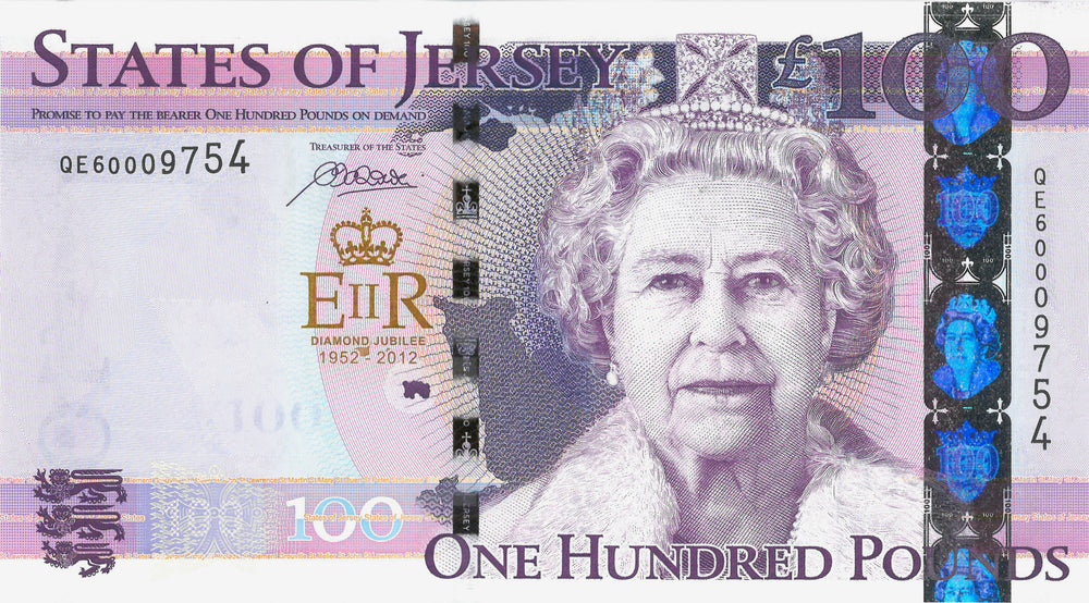 Jersey £100 banknote in mint condition. The £100 banknote was released to mark Queen Elizabeth II’s Diamond Jubilee. It features an image of the Queen by artist Chris Levine and holographer Rob Munday which was commissioned by Jersey in 2004.