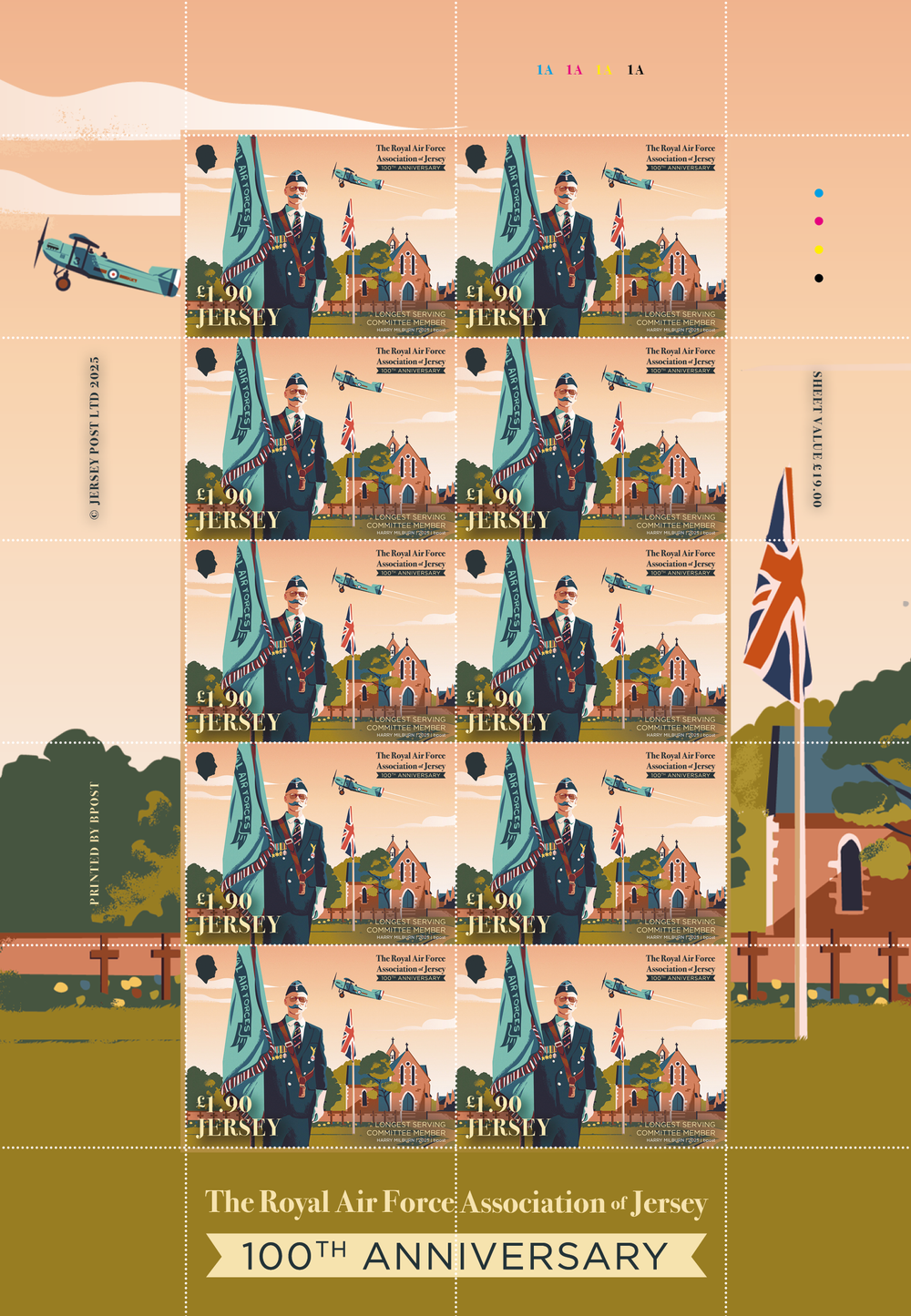 A Sheet of 10 Stamps from 'Royal Air Force Association of Jersey - 100th Anniversary' issue. Illustrated by Harry Milburn.