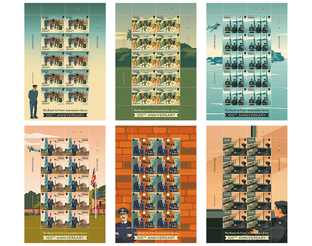 The complete sheet set from 'Royal Air Force Assocation of Jersey - 100th Anniversary' issue. Illustrated by Harry Milburn.