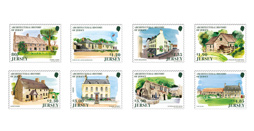 Illustrated by British artist Jenny Costello, the stamp set includes artwork of eight historical buildings located within Jersey, Channel Islands. The issue is available to pre-order but will officially be made available as of Thursday 27th March 2025.