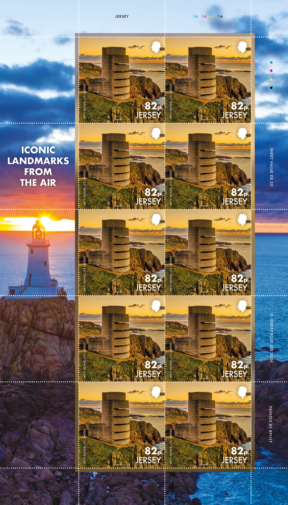 A Sheet of 10 Stamps from 'SEPAC Iconic Landmarks from the Air' issue. Images captured by local Jersey photographers Marc Le Cornu and James Bedding.