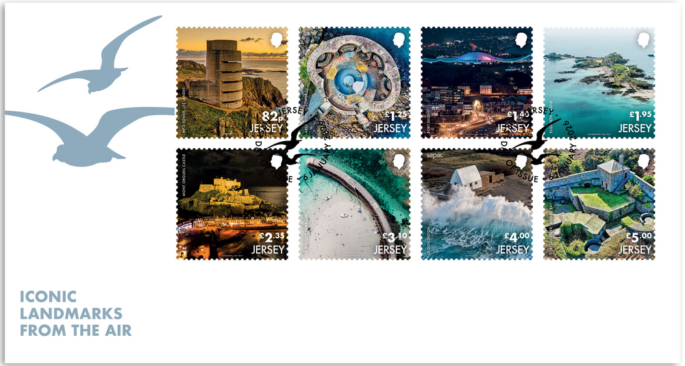 This First Day Cover displays the stamp set from our 'SEPAC Iconic Landmarks from the Air' issue. Images captured by local Jersey photographers Marc Le Cornu and James Bedding.