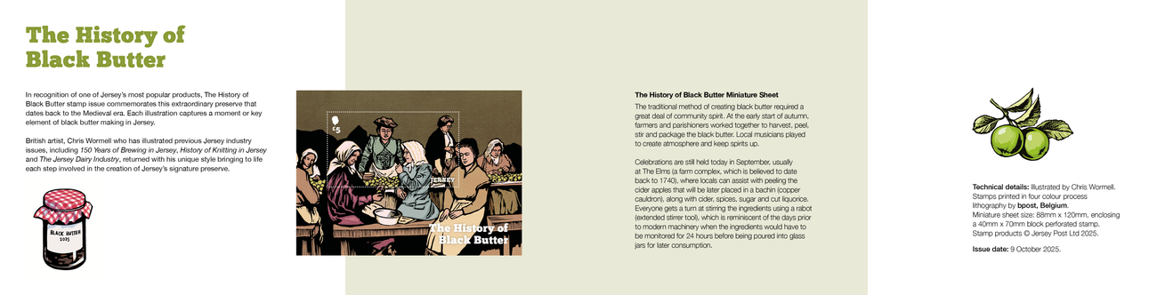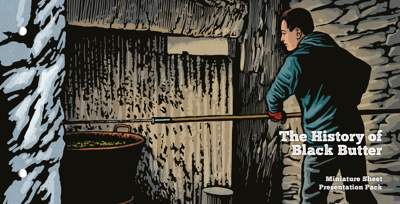This Presentation Pack encloses the miniature sheet from our 'The History of Black Butter' issue. Illustrated by Chris Wormell.