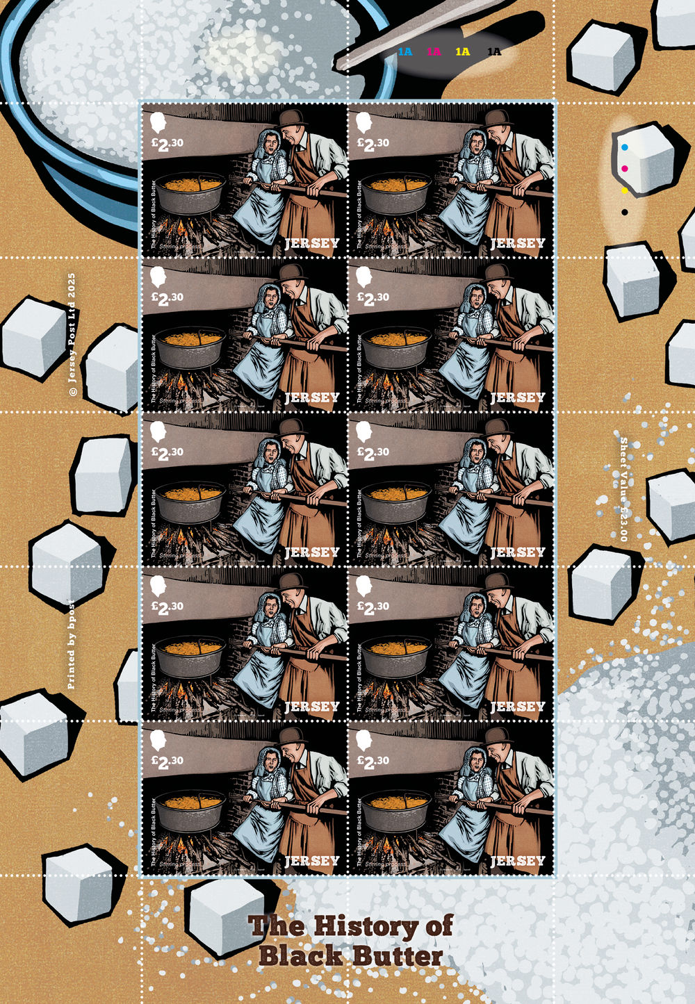 A Sheet of 10 Stamps from 'The History of Black Butter' issue. Illustrated by Chris Wormell.