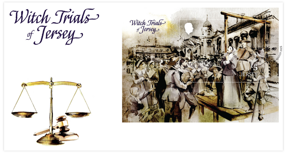 The first day cover includes the miniature sheet depicts a crowd gathering for the execution of Marie Esnouf who was sentenced to death in 1648. Her execution was said to have drawn crowds that hadn't been seen since the Prince visited Jersey.